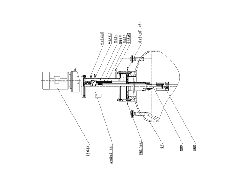 用稀土永磁制作的強(qiáng)磁回轉(zhuǎn)式耦合結(jié)構(gòu)(磁力驅(qū)動(dòng)裝置),磁力驅(qū)動(dòng)裝置的基本制造材料均為鐵磁性物質(zhì),磁導(dǎo)率極佳,磁場(chǎng)在穿過用于密封合金層時(shí)幾乎沒有損耗。由此外部驅(qū)動(dòng)永磁體產(chǎn)生的旋轉(zhuǎn)磁場(chǎng)可以有效被內(nèi)部永磁體轉(zhuǎn)子接受,進(jìn)而帶動(dòng)反應(yīng)器內(nèi)的攪拌部件進(jìn)行物料混合,攪拌速度為0~300r/min,甚至更高,可配推進(jìn)、槳式、錨式、框式、螺帶等各種槳。